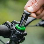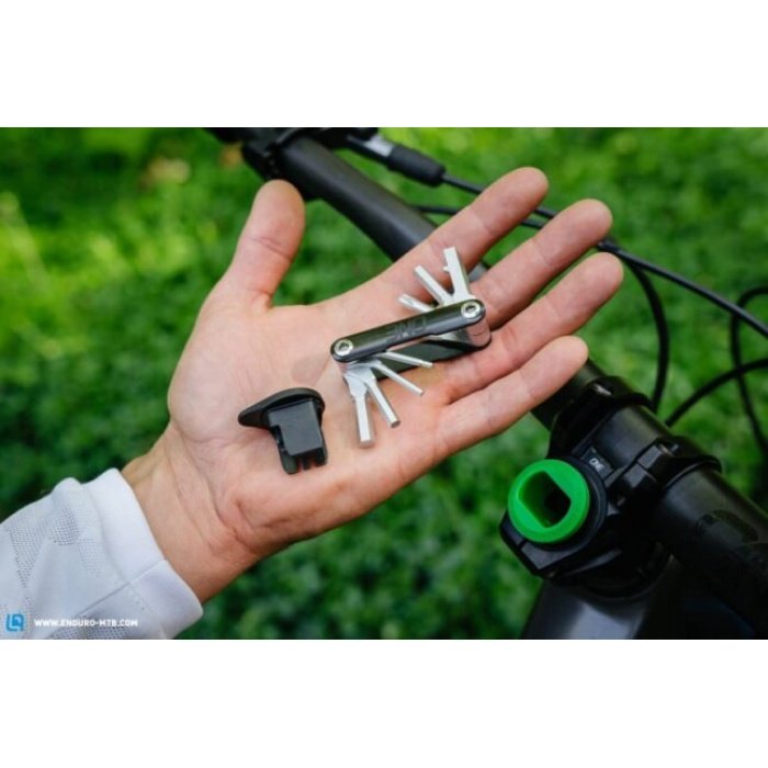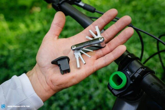 The OneUp Components EDC Lite Multi-Tool has nine functions and can be easily stored in the steerer tube via a special container. In contrast to the well-known EDC and EDC V2 tool set, no special threads have to be carved out and no special stem is necessary. The only requirement is that the fork has an Ahead star nut. The star nut is first pressed deeper using the included long bolt and a suitable hammer (not included). Insert the empty container about 7 cm deep into the steerer tube and fasten it to the star nut from the underside using the included short bolt. Now nothing can stand in the way of transporting the multi-tool in the fork. A plastic cap that replaces the stem cap helps pull the EDC Lite out of the container. Thanks to this practical and space-saving companion, you will never again be without the most important tool on the trail.